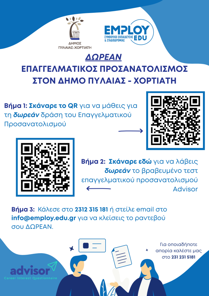 Η επιλογή σπουδών και επαγγέλματος αποτελεί ένα από τα πιο σημαντικά βήματα στη ζωή κάθε μαθητή. Για τον λόγο αυτό, ο Δήμος Πυλαίας - Χορτιάτη υλοποιεί δωρεάν δράσεις επαγγελματικού προσανατολισμού σε συνεργασία με την EMPLOY EDU | Σύμβουλοι Εκπαίδευσης και Σταδιοδρομίας, με στόχο να βοηθήσουν τους/τις μαθητές/τριες να ανακαλύψουν τα ενδιαφέροντα, τις δεξιότητες και τις κλίσεις τους, ώστε να κάνουν πιο συνειδητές επιλογές για το μέλλον τους.